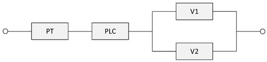 A long-running pressure vessel safety instrument system [] is composed of pressure transmitter (PT), programmable logic controller (PLC), valve 1 (V1) and valve 2 (V2). The PT measures the pressure in the vessel and feeds back to the PLC, and the PLC will shut down V1 and V2 when the pressure exceeds the warning value. Figure 4 is reliability block diagram of the system, in which V1 and V2 are connected in parallel and then connected in series with PT and PLC.