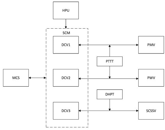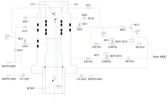 Figure 7 shows the composition and function of the subsea ESD system [], which performs the functions of both basic process control system (BPCS) and safety instrumented system (SIS) during oil and gas production. During normal production, the master control station (MCS) gives control instructions, and the offshore equipment opens the surface-controlled subsurface safety valve (SCSSV) through the SCM. The production master valve (PMV) and the production wing valve (PWV) remain normally open, and the subsea oil and gas are transmitted through the main loop pipeline. In case of production emergency, the temperature or pressure measured by the pressure transmitter and temperature transmitter (PTTT) will exceed the maximum limit. At this time, the hydraulic directional control valve controlled by SCM will lose power, forming oil return. The hydraulic oil pressure in the driver chamber of the PMV will decrease, then the reset spring closes the PMV. If the PPTT is still feeding back data, it will continue to close the PWV. In the event of pipeline leak or fire at production facility that cannot be prevented by the shutdown of the PMV and the PWV, the SCSSV will be closed to avoid a blowout and other accidents. When the SCSSV cannot be closed, the hydraulic power unit (HPU) will act directly to return the hydraulic oil to close the SCSSV.