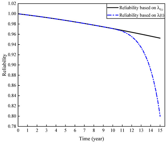 - Compared with the constant failure rate, the system reliability with the time-varying failure rate decreases faster and reaches 0.7995 in the fifteenth year. The reliability in the fifteenth year in engineering experience is about 0.8, so the time-varying failure rate model proposed in this paper is consistent with the actual situation and can eliminate the reliability evaluation error caused by the constant failure rate.