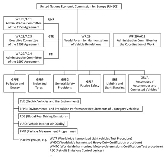 The circulation of vehicles in a country requires the approval of the vehicle type and/or its components. Different national regulations and approval procedures mean additional time and costs for the manufacturers due to additional designs, tests, and approvals. Thus, it is highly desirable to harmonise the technical requirements and regulations for the vehicle type approval at an international or even a global level. The main organisation where such effort is taking place is the World Forum for Harmonization of Vehicle Regulations (WP.29) [] under the United Nations Economic Commission for Europe (UNECE) []. There are six subsidiary bodies, also known as GRs (Groups of Rapporteurs) (Figure 1). The one relevant to vehicle emissions is the Working Party on Pollution and Energy (GRPE) []. Any United Nations (UN) member country and any of their regional economic integration organisations may participate in the activities of the World Forum and may become a contracting party to the Agreements (which will be discussed below). Governmental and non-governmental organisations (NGOs) may also participate in a consultative capacity in WP.29 or in its subsidiary working groups. The WP.29 convenes three times a year (March, June, and November). The sessions of each subsidiary body are usually held twice a year. The work of the World Forum is transparent: all agendas, working documents and reports are openly accessible on the Internet website of the World Forum.