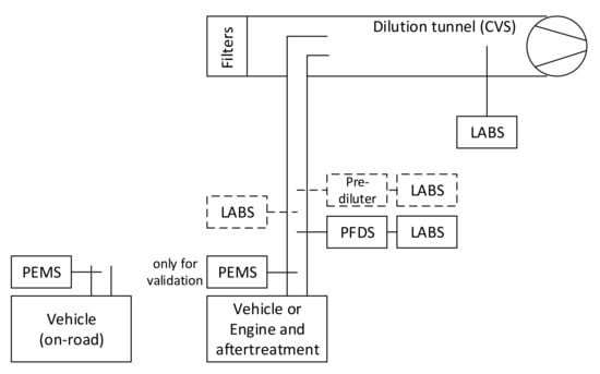 Sampling possibilities of laboratory particle number systems (LABS) and portable emission measurement systems (PEMS). Dashed lines show cases under discussion for inclusion in the regulation. Validation is the check of the PEMS with LABS. CVS = constant volume sampling; PFDS = proportional partial flow dilution system.