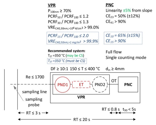 Figure 3 plots a LABS according to the current (23 nm) technical specifications. It also gives the improvements of the 23 nm systems and the future 10 nm requirements. The laboratory systems (LABS) consist of a volatile particle remover (VPR) and a particle number counter (PNC). The VPR extracts a small flow, having a probe in a dilution tunnel (full flow or proportional partial flow). Optionally, a sampling line connects the VPR to the sampling probe. The VPR has to dilute the sample at least ten times, and the mixture temperature has to be at least 150 °C. Theoretically, a system heated at, for example, 160 °C fulfils the design requirements of the regulation (but would still have to fulfil the performance requirements for volatile removal efficiency, see below). Nevertheless, the recommended system described in the regulation, which was based on the PMP suggested system, includes an evaporation tube at 350 °C. The PNC has to be full flow and count particles in the single counting mode. Other calibration requirements regarding the particle concentration reduction factor (PCRF) and the volatile removal efficiency (VRE) of the VPR, as well as the counting efficiency (CE) of the PNC, are summarised in Figure 3. The PCRF, VRE, and CE are determined during the calibration of the device, with an appropriate aerosol measuring monodisperse in parallel with a reference instrument. For a given dilution setting of the VPR, PCRF is the ratio of the upstream to downstream concentration of solid particles of a specific size, and it is an indication of the dilution and the particle losses at the specific size for the VPR. Volatile removal efficiency is one minus the ratio of downstream to upstream concentration of volatile (tetracontane) particles with size >30 nm. Counting efficiency is the ratio of inlet to outlet concentration of particles for the PNC. Details can be found elsewhere [].