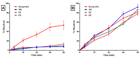 In vitro dissolution profiling of ester prodrugs of ketoprofen showing % drug dissolved in HCl buffer pH 1.2 (A) and phosphate buffer pH 6.8 (B). Data was expressed as mean ± SEM, where n = 6. ME: Methyl 2-(3-benzoyl phenyl) propanoate, EE: Ethyl 2-(3-benzoyl phenyl) propanoate, PE: Propyl 2-(3-benzoyl phenyl) propanoate.