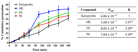 % Cumulative intestinal permeation of ester prodrugs of ketoprofen assayed by ex vivo Ussing chamber method; data was expressed as mean ± SEM, where n = 3. ME: Methyl 2-(3-benzoyl phenyl) propanoate, EE: Ethyl 2-(3-benzoyl phenyl) propanoate, PE: Propyl 2-(3-benzoyl phenyl) propanoate, Papp: Apparent permeability, R: Absorption enhancement ratio. A value of * p < 0.05 (compared to ketoprofen) was considered significant.