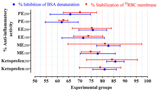 In vitro anti-inflammatory activity of ester prodrugs of ketoprofen assayed by BSA denaturation (blue) and human red blood cell haemolysis (red) techniques. Ketoprofen100 and Ketoprofen200: Ketoprofen 100 mg/kg and 200 mg/kg respectively, ME10: Methyl 2-(3-benzoyl phenyl) propanoate (10 mg/kg), ME50: Methyl 2-(3-benzoyl phenyl) propanoate (50 mg/kg), ME100: Methyl 2-(3-benzoyl phenyl) propanoate (100 mg/kg), EE10: Ethyl 2-(3-benzoyl phenyl) propanoate (10 mg/kg), EE50: Ethyl 2-(3-benzoyl phenyl) propanoate Ethyl 2-(3-benzoyl phenyl) propanoate (50 mg/kg), EE100: Ethyl 2-(3-benzoyl phenyl) propanoate (100 mg/kg), PE10: Propyl 2-(3-benzoyl phenyl) propanoate (10 mg/kg), PE50: Propyl 2-(3-benzoyl phenyl) propanoate (50 mg/kg) and PE100: Propyl 2-(3-benzoyl phenyl) propanoate (100 mg/kg). Data was expressed as mean ± SEM, where n = 3.