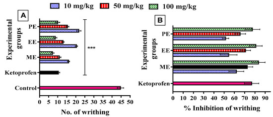 Acetic acid induced writhing test of ester prodrugs of ketoprofen, where (A): no. of writhing, and (B): % inhibition of writhing. Data are expressed as mean ± SEM, where n = 5. A value of *** p < 0.001 (compared to control) was considered significant.