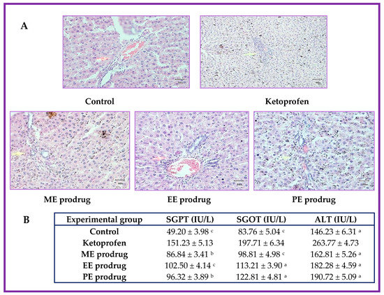 Hepatotoxicity of ester prodrugs of ketoprofen. (A): Histopathology of liver of experimental groups, (B): Liver function enzymes of experimental animals. Data was expressed as mean ± SEM, where n = 5. Values of a: p < 0.001, b: p < 0.01 and c: p < 0.05 vs. ketoprofen treated group were considered significant.