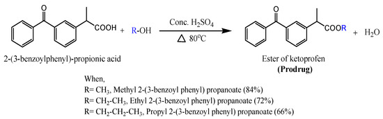 The following are available online at https://www.mdpi.com/article/10.3390/pr9122221/s1, Figure S1: 1HNMR spectra of synthesized prodrugs of ketoprofen; A, B and C represented methyl 2-(3-benzoyl phenyl) propanoate, ethyl 2-(3-benzoyl phenyl) propanoate and propyl 2-(3-benzoyl phenyl) propanoate respectively, Figure S2: IR spectra of synthesized prodrugs of ketoprofen; A, B and C represented methyl 2-(3-benzoyl phenyl) propanoate, ethyl 2-(3-benzoyl phenyl) propanoate and propyl 2-(3-benzoyl phenyl) propanoate respectively, Table S1: Characterization of methyl, ethyl and propyl ester prodrugs of ketoprofen synthesized by esterification reaction, Table S2: Predicted LD50 values, toxicity class and organ toxicity of synthesized ester prodrugs of keto-profen, Table S3: Interactions of ester prodrugs with physiologically important transporters and enzymes account-able for induction of pathogenicity.