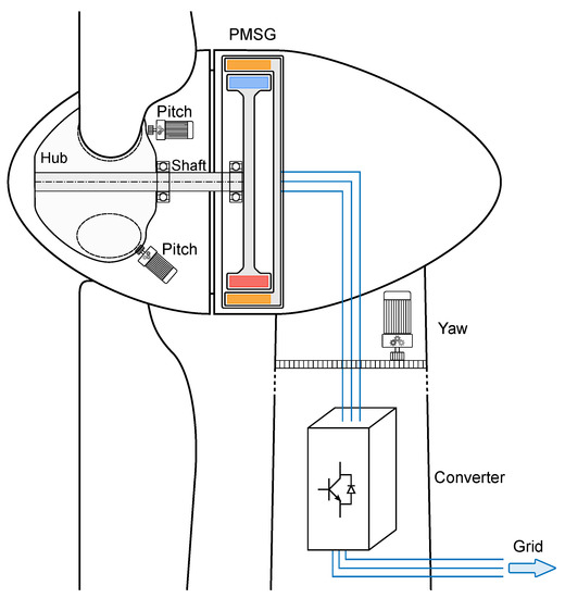 Figure 2 gives a schematic overview of the modern PMSG-based wind turbine with its essential components. The turbine blades are connected to the hub in the nacelle. Pitch systems are integrated in the hub to adjust the blade’s pitch angles. The main shaft connects the hub to the PMSG. The electrical output of the PMSG is connected to the converter to feed power into the grid. A transformer (not depicted here) is usually present at the grid side to convert the voltage to medium or high voltage levels for the distribution or transmission grid, respectively. Finally, a yaw system between the nacelle and the tower regulates the turbine’s angle with respect to the wind direction. In what follows, the depicted components will be discussed in more detail.