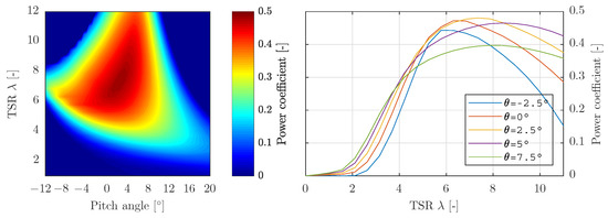 Simulated power coefficient as a function of the TSR and pitch angle for the 1.5MW WP turbine model in FAST [37]: Contour plot (left) and separated characteristics (right).
