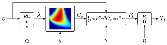 The combination of a numerically characterized power coefficient and the Equations (1)–(3) can form a digital model of the turbine aerodynamics. Figure 4 schematically shows this digital model. Aside from the primary input v and output , the rotor speed and blade pitch angle are also required as additional inputs. As will be explained later, the rotor speed , the blade pitch angle and the yaw angle are feedback signals coming from the mechanical dynamics, pitch and yaw system models respectively.