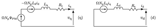 Similarly, lumped parameter thermal network models of electrical machines can be used for virtually sensing internal temperatures [115]. Several analytical models are available to extend the rotating reference frame model and increase its fidelity, without the computational burden of FEM. Iron losses can be included in the equivalent scheme of Figure 5 by means of an additional speed-dependent iron loss resistance [116,117,118], thus, modelling both the hysteresis and eddy current losses.