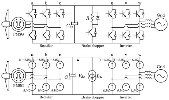 Modern PMSG-based wind turbines use a power electronic converter rated for the full power of the turbine. Figure 6 (top) shows the typical topology of the back-to-back AC/DC/AC converter commonly used for large wind turbines. Due to the variable rotor speed, the generator’s output voltage has a varying frequency and amplitude. The active AC/DC rectifier converts this variable AC to the common DC-link.