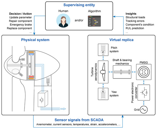 For example, Ref. [29] presents a data-driven approach to realize a digital twin for anomaly detection using weakly supervised learning. It is important to note that the digital twin itself does not possess the intelligence to take decisions that affect the physical system. Rather, the digital twin is used to inform a supervising entity that, e.g., a parameter requires an update to maintain optimality in the control, a component needs repair or replacement or a structural overload is detected. This supervising entity can either be a human operator or an automated algorithm making decisions.