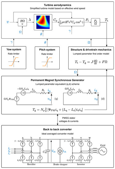 The virtual replica is the heart of the digital twin. It can be constructed in a modular manner by interlinking models of different components, considering the compatibility with each others inputs and outputs regarding the data type and sampling rate [32]. This section gives an overview of these components, specifically for a modern direct-drive PMSG-based wind turbine, and of the recent literature describing different relevant modelling techniques.