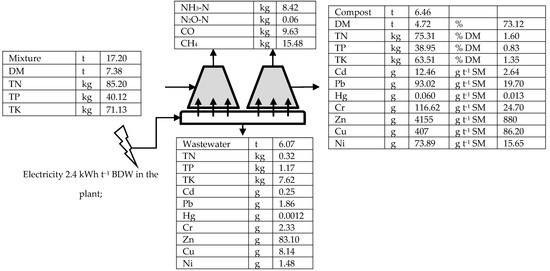 After the plant staff survey and analysis of the produced compost quality and contamination parameters (average value n = 3), and analysis of scientific literature, the mass balance was calculated (see Figure 1). According to the compost quality analysis and loss of material during composting (see Section 2.2), the NPK in the input material was calculated.