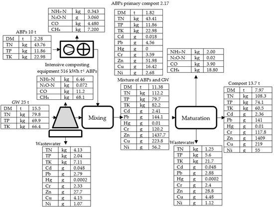 During the intensive composting of catering ABPs, no wastewater was generated due to external heating and evaporation. For this reason, the quantities of K and P remained the same in the lower-mass material. In a previous study, Kliopova et al. (2019) reported that 0.0416 kg of NH3 was generated per ton of catering ABPs. These findings were used to evaluate the loss of TN in the form of NH3 (0.343 kg) from the system. As N2O emissions were not measured, the emissions factor for aerated compost was taken from Yang et al. (2019). The N balance was calculated in accordance with N emissions.