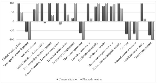 To highlight the environmental benefits, current and planned catering ABP management approaches were interpreted by applying the LCA method. After the analysis (characterization) of both approaches, a reduction was observed in 12 environmental impact categories from a total of 18. For instance, the environmental impact in the climate change category was reduced by 48%, ozone formation by 107%, fossil resource scarcity by 83%, etc. (see Figure 3). The same impact categories with their corresponding units were depicted in Table 3.