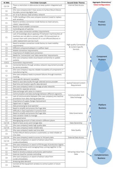 The third layer, context BMs, provides structure and navigation for online users, increasing the transparency of existing online data in a specific context [28]. In this type of business, the need for high-quality connection and context-specific services in different places was identified from the responses, such as “If you have 1000 employees and you connect each of them with some wearable so on, then you start to have lots of mobile types of needs” and “If a connection is not working, that location loses capacity, basically”. On the other hand, existing equipment and capabilities regarding communication and data exchange facilitate the use of context-specific, underutilized data, which were categorized as resources from the data: “In sub-floor layer devices, clients and end users are creating data”. The final commerce layer of 4C BMs refers to the ability to commercialize any or all of the connection, content, or context-specific resources, actors, or activities that are associated with ongoing communications [14]. The findings show that most of the needs that are mentioned in content BMs have been repeated here, with a higher focus on the importance of information transition and extracting value from data through external data access. For example, “Combining relevant data in structured way, we hope to enable some future use cases such as further analytics, machine learning, and AI solutions. We want to extract value, so storing the data is not point; we have some business targets, we are not just doing study” and “We need to get all the data from a third party (third parties say some parts of processes are not necessary for your company)”.