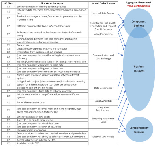 For the data analysis, we divided the acquired information into two categories: case factory needs and case factory resources. Quotations of both needs and resources were coded and classified according to their relevance with the 4C, BMs. The data were analyzed using three consequential processes of Gioia’s systematic procedure. Firstly, the records of the workshop were transcribed and analyzed to form various categories reflecting on the differences and similarities between quotations. Subsequently, the categories that were identified were given descriptions (labeling) that build “first-order concepts” of data structure. Figure 2 depicts the three sequential steps of the Gioia approach and shows the data structure, explaining how the collected data was analyzed in this study. Multiple interpretations were possible due to the overlapping statements in the data analysis. For instance, the statement “the case company is in search of extract value from (underutilized) data” could be ascribed to content as well as commerce-related needs. In another quotation, for example, the quotation “need for sharing real-time transactional data through web services instead of a per-day update” could be compressed into the needs of the case company, related to real-time data. Next, the identified categories were labelled with phrase descriptions which produced the first-order concepts. Second-order themes were explored next, emphasizing the novel notions that have fewer references in the previous literature. The question that was related to the credibility of the second-order themes is whether they could offer ideas that can help us define the phenomenon we were investigating was answered during this process. After this step, the groups of quotes were coded with appropriate labels for all of the sub-set concepts. The labels were used as emerging themes in the Gioia method’s second process. In this study, after the classification of connection, content, context, and commerce-related needs and resources, a color code was given to each quotation to clarify to which of the 4C layers it belonged. Finally, aggregate dimensions that were based on second-order theme connections were created to construct broader categories that aggregated similar concepts or thoughts [61]. Then, the aggregate dimensions of the data structure were utilized to discover potential business prospects for local operators. This process is based on [27] business model prototypes, which use a value creation-centric approach to identify potential business opportunities and associated value configuration in future factories. The value configuration models include needs (N), resources (R), and value co-creators (VCC) as players within the future factory business ecosystem.