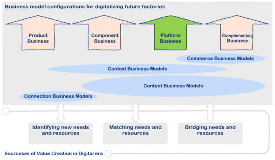Following up on the study findings that are presented in the previous section, we have developed a new combination of business model configurations for digitalized future factories. Assessing the role of local operators in the digital age based on 4C BMs [28] allows us to refine and empirically and conceptually validate the resource configuration-based theoretical framework [27]. Empirically, the modified framework (Figure 10) illustrates alternative value configurations with corresponding needs and resources that are based on 4C BMs. From a business ecosystem perspective, the framework emphasizes the importance of value logic in the development of innovative BM as well as the need for systematic thinking when establishing potential business opportunities for digitalized future factories, taking into account the needs and resources of all value co-creators in an ecosystem setting [51,52]. Conceptually, value can be created and captured in a novel way by matching and bridging a future factory’s identified needs and resources. This provides a basis for the developed framework (Figure 10), which is built upon resource configuration framework and logic of value creation in the digital age, as presented by [27]. From the BM perspective, this framework gives a clear idea about how the 4C BMs may be exploited to cooperate [28] and support each other [29] in the value creation of an ecosystem to allow value capture from potential business opportunities. There is a clear fit between digitalization-driven business opportunities and the identified needs and resources, as the majority of the needs and resources are related to the platform and complementary business opportunities. The 4C BM analysis of identified needs and resources reveals that the most addressable needs and underutilized resources are grouped in content and context BMs. In other words, content- and context-related businesses are primary business fields for the case company. This result has been depicted at the top of the value creation sources in the framework to present a comparative picture of needs and resources in the case company and a solid foundation for possible business opportunities for local operators in digitalized future factories. In short, the possible emerging business opportunities revolve around collaborative business models that are linked to the future factories’ content- and context-related needs and resources.
