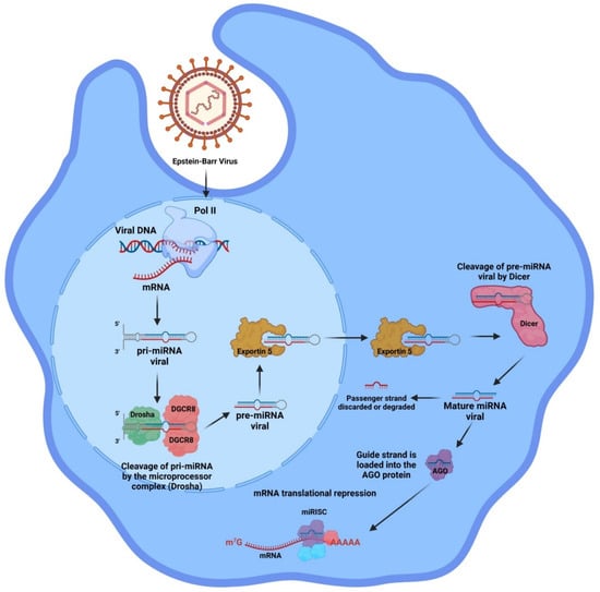EBV belongs to the herpesviruses family and it is known that herpesviruses are characterized by presenting long term infections in their host. EBV has developed mechanisms to remain undetectable by the immune system. These mechanisms involve restricted gene expression, epigenetic control of the viral–host gene, expression control, and translation. To achieve this, EBV uses (as well as other viruses) miRNAs to regulate its own gene expression and the inhibition of the production of its proteins and those of the host, allowing it to go unnoticed within infected cells [5]. For example, EBV can maintain infection, preventing the recognition of natural killer (NK) cells through miR-BART2. This miRNA reduces the expression of the NK receptor activating ligand MICB. When a cell suffers “attacks” such as a viral infection, the cell can induce the expression of receptors such as MICA. These are recognized by activation receptors such as NKG2D that are present in NK cells. This activates NK cells and kills these transformed and virus-infected cells in a direct way [30].