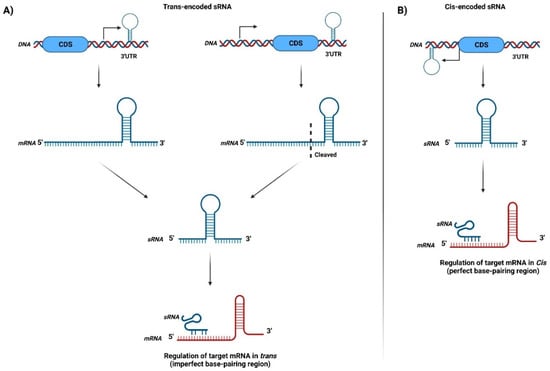 The biogenesis of sRNA from bacterial UTRs. The sRNAs could be either cis- or trans-encoded. (A) The trans-encoded sRNAs can be found in the 3’ UTR region and are transcribed from their promoter in the upstream coding sequence or by internal processing of mRNA containing the sRNA. Moreover, trans-encoded sRNAs form an imperfect base-pairing region with their target mRNA because these genes are separate from each other. Thus, there is no overlap between them. (B) The cis-encoded sRNAs overlap in the genes containing sRNAs but are localized on different strands. Moreover, these sRNAs form a perfect base-pairing region with target mRNA. CDS: coding sequence; sRNA: small RNA; UTR: untranslated region.