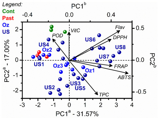 The type of processing was the main factor for sample discrimination, with the sequential non-thermal processes at negative scores and PAST clustered with the control sample at positive scores. Both sequential non-thermal processes favored high values of flavonoids. The control samples, and the other processes clustered at positive scores, favored high POD, DPPH, ABTS, FRAP, vitamin C, and TPC values. Similarly, Traore et al. [6] also reported increased TPC and flavonoid contents of cabbage after US (40 kHz, 8 and 20 min) and US.OZ at 0.7 mg/L for 8 min processing when compared to the control.