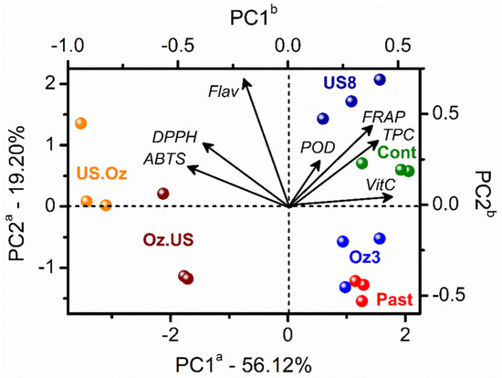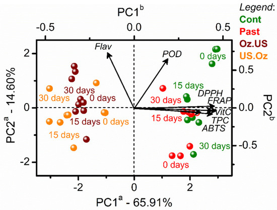 The effect of the sequential non-thermal processing order (OZ followed by US and vice versa) were similar, as indicated by their clustering at negative scores of PC1 for all stability periods (0, 15, and 30 days). Sequential processing imparted low values of all studied variables (concentrations of vitamin C, TPC and flavonoids, POD, DPPH, ABTS, and FRAP) mainly after 15 days of storage. On the other hand, concentrations of flavonoids were still high after 30 days. Additionally, the control and PAST samples clustered at positive scores, indicating high vitamin C and TPC levels and antioxidant activity (DPPH, ABTS, and FRAP).