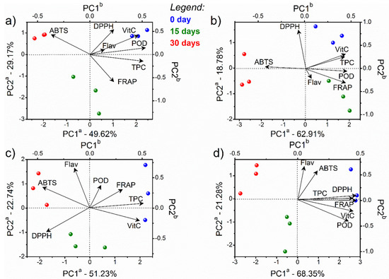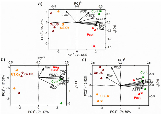 All of the samples presented the same score tendency based on the evolution of the stability period, from positive (0 days, in blue) to negative scores of PC1 (30 days, in red), independent of the process. The respective loadings described differences according to the sample’s properties (POD, DPPH, ABTS, FRAP, vitamin C, TPC, and flavonoids). The storage for 30 days influenced high values of ABTS for the unprocessed samples (Figure 4a), the samples processed by PAST (Figure 4b), and the samples processed by OZ followed by US (Figure 4c). High amounts of flavonoids were observed in samples processed by OZ followed by US. All of the variables (POD, DPPH, ABTS, FRAP, vitamin C, TPC, and flavonoids) were high for the US.OZ processed samples at day 0 (Figure 4d). High concentrations of flavonoids, TPC, and vitamin C were observed mainly at 0 days in the unprocessed, pasteurized, and US.OZ processed juices. PAST did not negatively affect the concentration of the bioactive compounds of the cashew apple juice. However, the ascorbic acid content was reduced by 20% during the storage period. Figure 5 presents the PCA results from the stability periods evaluated separately at 0 (a), 15 (b), and 30 days (c).