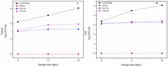 Total mesophilic aerobic bacteria microorganisms (log CFU/mL) (A) and yeasts and molds (B) counts (log CFU/mL) during cold storage of unprocessed (