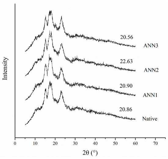 The native and annealed glutinous rice flour displayed strong characteristic diffraction single peaks at 15°, 23.5° and dual peaks at 17–18° (Figure 1), indicating the samples were A-type patterns, and annealing treatment did not change the type of glutinous rice flour. However, the crystallinity increased slightly for ANN1 and ANN2, from 20.86 to 20.90 and 22.63 respectively. The result was consistent with Wang et al. [20] who reported that annealing treatment did not alter the XRD patterns of pea starch granules, but slightly increased the relative crystallinity of pea starch granules. The starch granules were partially rearranged, the structure was more orderly, and spiral structure arrangement was closer during annealing treatment. In addition, crystallite perfection and size increased, the new crystallites were formed or the ordering of amylose-lipid complex was enhanced [21]. However, the crystallinity of sample ANN3 decreased slightly, because of the strong treatment, which may damage some crystalline area of starch granules.
