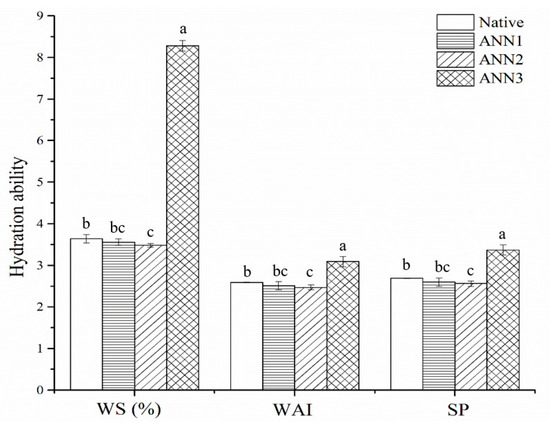 Figure 2. Water solubility (WS), water absorption index (WAI) and swelling power (SP) of native and annealed glutinous rice flour. ANN1, 55% moisture, 50 °C, 4 h; ANN2, 55% moisture, 50 °C, 6 h; ANN3, 50% moisture, 55 °C, 6 h. Results are expressed as mean ± standard deviation. The letters a, b, and c above the bars indicated significant differences (p < 0.05) among the groups.