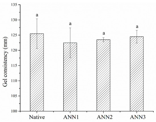 Figure 3. Gel consistency of native and annealed glutinous rice flour. ANN1, 55% moisture, 50 °C, 4 h; ANN2, 55% moisture, 50 °C, 6 h; ANN3, 50% moisture, 55 °C, 6 h. Results are expressed as mean ± standard deviation. The same letters above the bars indicated no significant differences among the groups (p > 0.05).