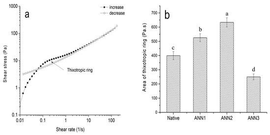 Thixotropy is the process that the liquid inner friction is reduced on shear after the destruction of the inner structure [27]. The most common method to determine thixotropy of the pastes is the test of the hysteresis loop [28,29]. As shown in Figure 4a, native and annealed gelatinized glutinous rice flour samples could form a thixotropic ring, and the areas of thixotropic ring of different samples were shown in Figure 4b. Compared with the native glutinous rice flour, the area of thixotropic ring of ANN2 was the largest, indicating that it had the strongest thixotropic property. The area of thixotropic ring of the sample ANN1 was slightly reduced compared with ANN2. However, the thixotropic property of the sample ANN3 reduced dramatically as compared with native sample. It confirmed that the annealing treatment conditions had a significant impact on the rheological property of glutinous rice flour [10]. The thixotropic property of sample ANN3 decreased, because the network structure of the pasted starch was damaged under the strong treatment condition. However, the gel systems formed by sample ANN1 and ANN2 were more stable, and more energy was required to destroy the network.