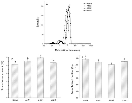 Figure 5. The distribution of water of fast-frozen glutinous dumplings made from native and annealed glutinous rice flour: (a) the curve of water distribution; (b) the content of bound water; (c) the content of immobilized water. ANN1, 55% moisture, 50 °C, 4 h; ANN2, 55% moisture, 50 °C, 6 h; ANN3, 50% moisture, 55 °C, 6 h. Results are expressed as mean ± standard deviation. The letters a, b, and c above the bars indicated significant differences (p < 0.05) among the groups.