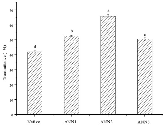 Figure 6. Transmittance of the soup of fast-frozen glutinous dumplings after boiling. Results are expressed as mean ± standard deviation. The letters a, b, c and d above the bars indicated significant differences (p < 0.05) among the groups.