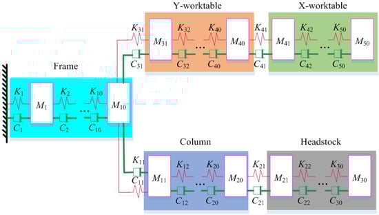 As shown in Figure 1, the simulation system includes five components and 50 degrees of freedom []. Among them, degrees of freedom 1–10 represent the base, degrees of freedom 11–20 represent the column, degrees of freedom 21–30 represent the headstock, degrees of freedom 31–40 represent the Y workbench, and degrees of freedom 41–50 represent the X workbench.
