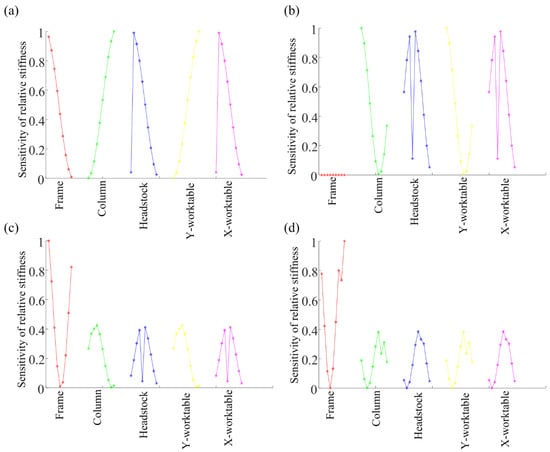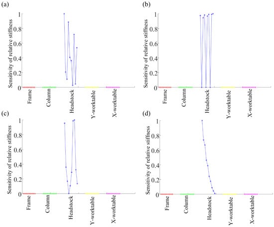 In case B, the dynamic stiffness sensitivity of the relative stiffness change of each degree of freedom of the system is analyzed, as shown in Figure 3. Figure 3a shows the first-order modal dynamic stiffness sensitivity of each degree of freedom of the system. The dynamic stiffness sensitivity of the spindle box is much greater than that of other components. In addition, Figure 3b shows the second-order modal dynamic stiffness sensitivity of each degree of freedom of the system, Figure 3c shows the third-order modal dynamic stiffness sensitivity of each degree of freedom of the system, and Figure 3d shows the fourth-order modal dynamic stiffness sensitivity of each degree of freedom of the system. In the second–fourth-order modal dynamic stiffness-sensitivity distribution diagrams, the modal dynamic stiffness sensitivity of the headstock is also greater than that of other components. From the results of the dynamic stiffness sensitivity of the first four modes of each degree, the dynamic sensitivity of the headstock stiffness change is much larger than that of other parts, and the headstock sensitivity ratio coefficient has obvious mutations. Therefore, the headstock was judged to be a sensitive part of the system, which was consistent with the set result, thus proving the accuracy of identifying sensitive parts based on the sensitivity of dynamic stiffness.