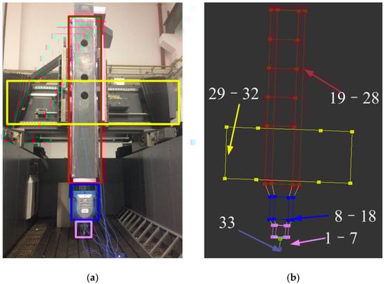 A total of 33 measuring points are arranged in the five-axis gantry machining center for measurement and analysis, as shown in the layout of measuring points in the percussion experiment in Figure 4, and three-way acceleration sensors are used for signal acquisition. Measuring points 1–7 are arranged on the spindle part, measuring points 8–18 are arranged on the spindle head part, measuring points 19–28 are arranged on the ram part, measuring points 29–32 are arranged on the beam part, measuring point 33 is arranged on the tool handle part, and measuring point 33 is set as the reference point of the experiment. As the data acquisition equipment can only connect 12 acceleration sensors at a time, with the exception that the three-way acceleration sensor on the spindle head component needs to be fixed as the reference point, the other 11 acceleration sensors move three positions, respectively, to complete the measurement of all measuring points.