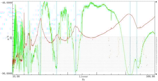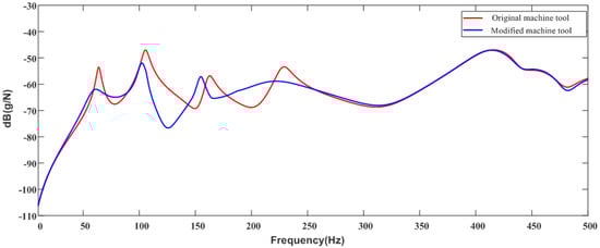 After modifying the physical parameters of the spindle head components, the FRF comparison diagram of the whole machine at 10–500 Hz before and after the change of the spindle head stiffness is obtained by fitting in the modal prediction module, as shown in Figure 9. The amplitude of the FRF after the stiffness of the spindle head is increased is reduced compared with the original machine tool, i.e., the stiffness of the whole machine is effectively improved after the stiffness of the spindle head is increased. The modal analysis software is used to identify the FRF of the whole machine before and after the modification of the swing head, and the comparison table of dynamics before and after the modification of the spindle head is obtained, as shown in Table 3. It can be seen from the table that the natural frequencies of the first six modes of the machine tool decrease in varying degrees, and the amplitude corresponding to the natural frequency decreases significantly, which proves that improving the stiffness of the sensitive parts can effectively improve the stiffness of the whole machine, and also proves the reliability of judging the sensitive parts by the sensitivity of the dynamic stiffness.
