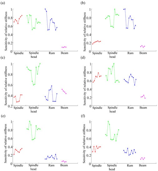 Figure 6a shows the sensitivity of the first modal dynamic stiffness of the machine tool to the stiffness change of each degree of freedom of the machine tool. It is easy to observe that the peak values of the red points, green points, and blue points have little difference, and they are much larger than the magenta points, i.e., the dynamic stiffness sensitivity of the beam relative to other components is low. Figure 6b shows the sensitivity of the second-order modal dynamic stiffness of the machine tool to the stiffness change of each degree of freedom of the machine tool. The peak values of the green points and blue points are close and the largest, while the peak values of the red points are the smallest, i.e., the dynamic stiffness sensitivity of the spindle head and sliding array is high. Figure 6c shows the sensitivity of the third-order modal dynamic stiffness of the machine tool to the stiffness change of each degree of freedom of the machine tool. The position of the green point is much higher than that of the blue point, red point, and magenta point, i.e., the dynamic stiffness sensitivity of the spindle head is much higher than that of other components. Figure 6d shows the sensitivity of the dynamic stiffness of the fourth mode of the machine tool to the stiffness change of each degree of freedom of the machine tool. It is easy to observe that the peak values of the red points, green points, and blue points have little difference, and are much larger than the magenta points, i.e., the dynamic stiffness sensitivity of the beam relative to other components is low. Figure 6e shows the sensitivity of the dynamic stiffness of the fifth mode of the machine tool to the stiffness change of each degree of freedom of the machine tool. Similar to the third mode, the sensitivity of the spindle head to the dynamic stiffness of other components is much higher. Figure 6f shows the sensitivity of the dynamic stiffness of the sixth mode of the machine tool to the stiffness change of each degree of freedom of the machine tool. Similar to the third mode, the sensitivity of the spindle head to the dynamic stiffness of other components is much higher. Considering the sensitivity of the first six modes of dynamic stiffness to the stiffness change of each measuring point of the machine tool, the spindle head component is determined as a sensitive component. It can be seen from Figure 6c,e,f that, in the sensitivity analysis of the dynamic stiffness of the third-order mode relative to the stiffness change of each degree of freedom of the machine tool, the dynamic stiffness sensitivity of the spindle head relative to other components is much higher. Therefore, the spindle head component is used as the sensitive component and the third, fifth, and sixth modes are used as the key modes to represent the dynamic characteristics of the machine tool. In addition, with the change in modal order, the dynamic stiffness sensitivity of each component of the machine tool will also change, and there is no obvious change law.