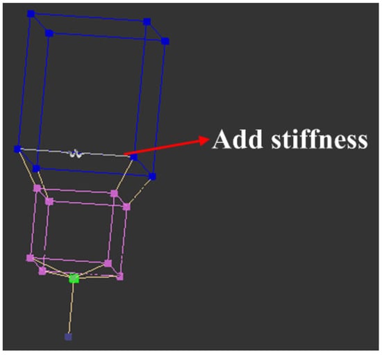 In the modal modification prediction module, the physical parameters of the original model can be modified according to the actual needs. The spindle head component is determined as a sensitive component through dynamic stiffness-sensitivity analysis, and in order to verify the impact of the sensitive component on the stiffness of the whole machine tool, a spring with stiffness of 1 × 1010 N/m is added between measuring point 1 and measuring point 2 of the spindle head component, as shown in the schematic diagram of physical parameter modification of modal modification and prediction in Figure 7. Figure 8 is a schematic diagram that more clearly shows the spindle head part after adding the spring, and the gray line is the spring added between the measuring points.
