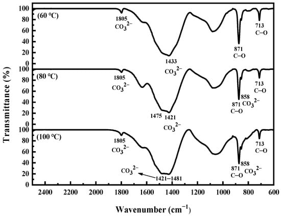 The FTIR spectra of carbonated AOD slag at different temperatures were shown in Figure 7. Characteristic infrared vibration peaks were detected at 713 cm−1, 871 cm−1, 1421–1481 cm−1, and 1805 cm−1 in carbonated AOD slags [19] corresponding to the C-O stretching vibration peak, C-O anti-symmetric stretching vibration peak, CO32− out-of-plane deformation vibration peak, and CO32− in-plane deformation vibration peak of CaCO3(C), it showed that calcite (CaCO3(C)) was formed in the carbonated AOD slag at different temperatures. It was worth noting that the carbonated AOD slag still had a characteristic infrared vibration peak at 858 cm−1 at 80 °C and 100 °C, corresponding to the CO32− out-of-plane bending vibration in aragonite (CaCO3(A)). It showed that aragonite (CaCO3(A)) was precipitated in the carbonated AOD slag, which was consistent with the analysis results of the above XRD analysis.