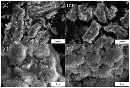 SEM morphology of AOD slag and carbonated AOD slag: (a)—AOD raw slag; (b)—60 °C AOD carbonated slag; (c)—80 °C AOD carbonated slag; (d)—100 °C AOD carbonated slag.