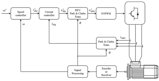 Due to the increase in electro-mobility, industrial applications of permanent magnet motors are expanding [1]. Permanent magnet motors are applied to various variable speed driving systems because their efficiency is higher compared to other motors and their output torque ratio per unit volume is excellent. In the vector control of general AC motors, a resolver or encoder is used for position detection, and a DSP is used to control the current and speed [2,3]. However, the position sensors of electric motors are vulnerable to external impacts so that they are damaged or deteriorated to the extent that they cannot work in some cases. To solve this problem, sensorless control techniques have been proposed [4,5,6,7,8]. In the case of the sensorless control of motors, the motors can be driven even without any position sensors such as encoders and resolvers so that the cost and system size are reduced, and reliability is enhanced because the risk of position sensor failure is reduced. However, a major disadvantage of sensorless motor control is that there are error values between actual motor information and estimated values. Therefore, sensorless systems cannot be used as main systems due to the limited performance of sensorless control, but there are cases where a sensorless control algorithm is used only as an emergency backup system when the position sensor does not operate normally or when it is out of order [9,10].