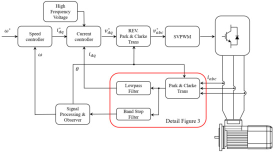 Schematic diagram of a sensorless motor control system using the square harmonic voltage injection technique.