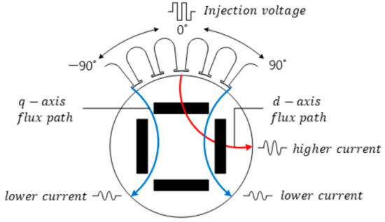 Equation (7) expresses the relational expression of the injected harmonics and harmonic currents [16]. In Equation (7), it can be seen that appears in the form of cosine and sine. Therefore, the rotor position can be estimated by taking the arc tangent to the harmonic d- and q-axis currents as expressed in Equation (8) [17,18,19].