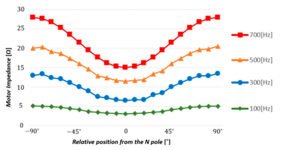 Figure 4 is a conceptual diagram of the magnitude of the current generated in the d- and q-axis magnetic flux paths corresponding to the harmonic voltage injected, and Figure 5 depicts the motor impedance corresponding to the injection position for each frequency of harmonic voltage [20]. When the harmonic voltage is injected into the d-axis, the impedance is minimized due to the phenomenon of saturation of the magnetic flux of the frequency corresponding to the harmonic voltage so that it becomes the position where the largest harmonic current for the same voltage occurs. This relationship applies equally to SPM and IPM. In the case of general inverters using an IGBT with a switching frequency of around 15 kHz, the frequency range of the voltage injected in previous studies is 200 to 1000 Hz. This corresponds to about 1/50 to 1/10 of the PWM frequency. Since the power semiconductor used in this study is capable of 100 kHz PWM, as with the GaN device, square waveform voltages in a range of 0.2~10 kHz corresponding to 1/50~1/10 of the switching frequency will be injected and the characteristics of rotor position detection will be investigated.