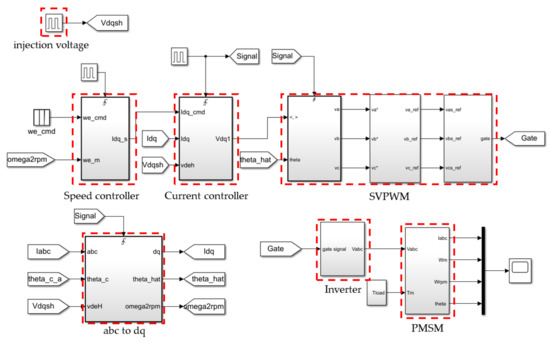 - Yoon, J.W.; Lee, D.M. Simulation Model of Harmonics Injection Sensorless Technique for Permanent Magnet Synchronous Motor. J. KAIS 2020, 24, 67–71. [Google Scholar]